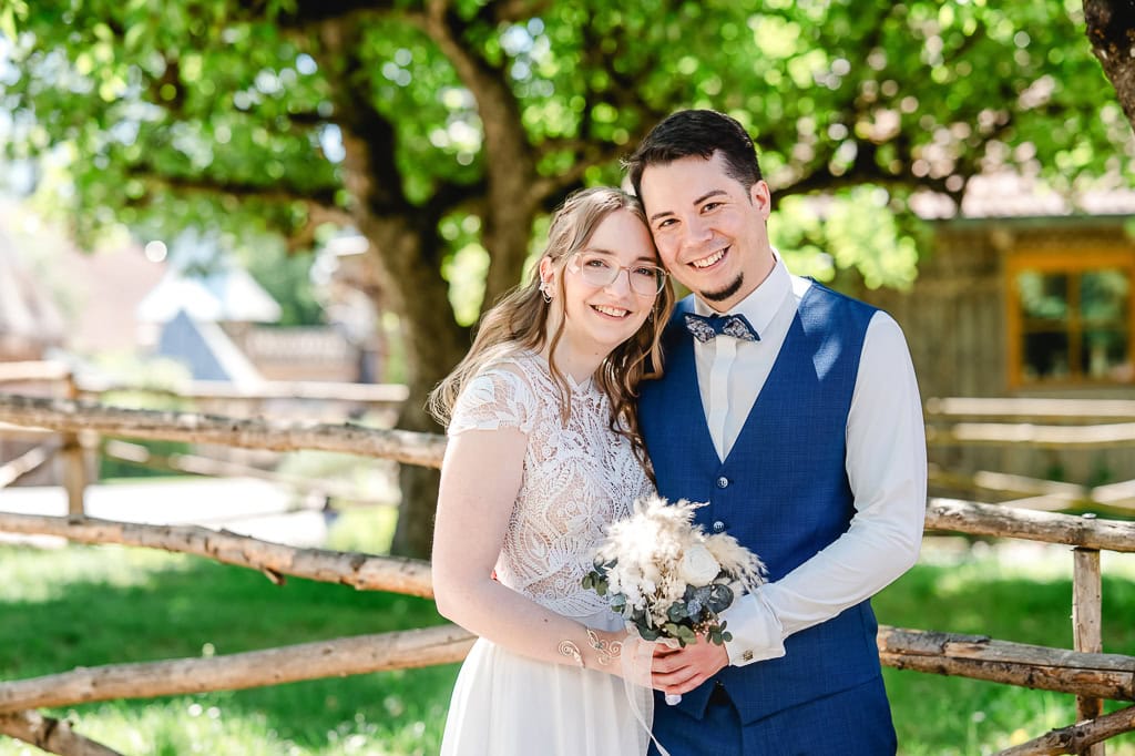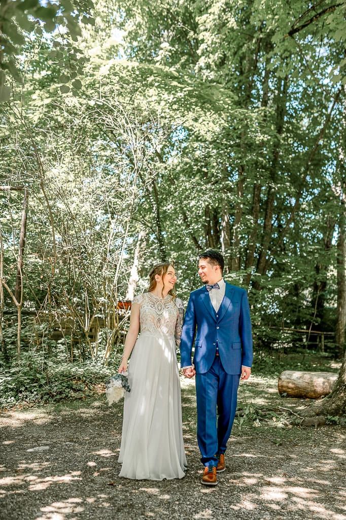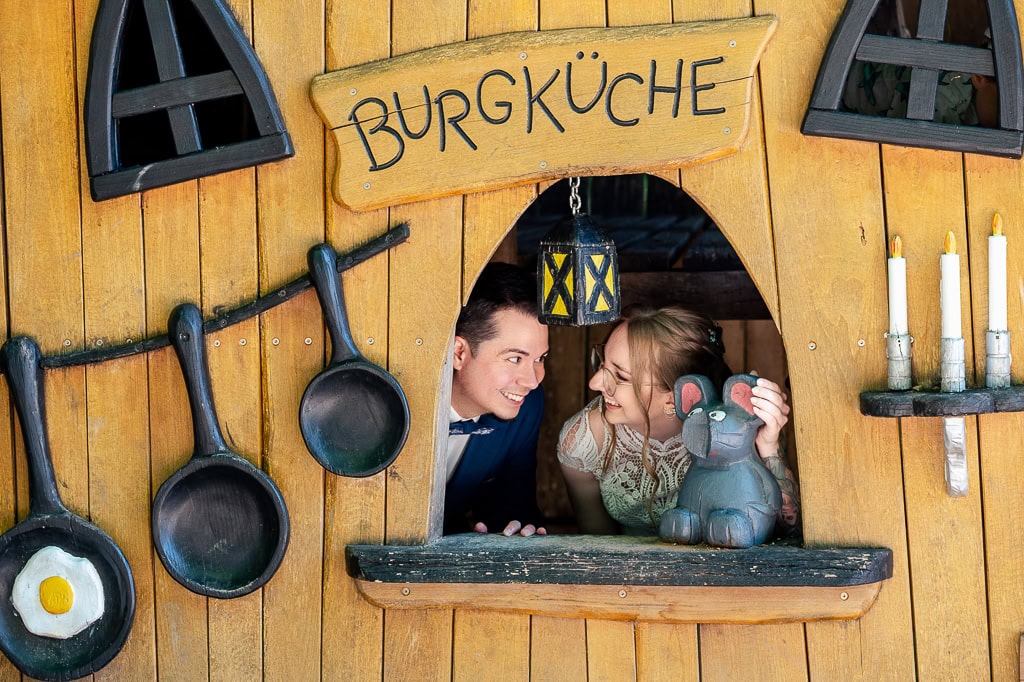 Besonders in Erinnerung geblieben ist mir, wie locker die beiden drauf waren. Sie nahmen sich selbst nicht zu ernst – und kletterten für ein Foto sogar in ein kleines hölzernes Spielhaus, die „Burgküche“. Als sie grinsend aus dem kleinen Fenster schauten, wusste ich: Das sind genau die authentischen Momente, die eine Hochzeit ausmachen.