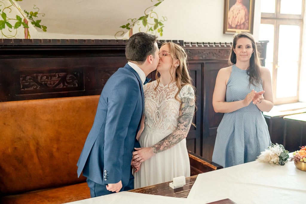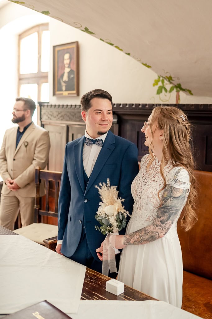 Als Katharina und Stefan dort am schweren Holztisch saßen, strahlend und völlig im Moment, war jeglicher Stress verflogen. Hier gab es kein nervöses Drängen auf die Uhr, wie man es oft in städtischen Ämtern erlebt. Es gab nur echte Emotionen, das Anstecken der Ringe und diesen besonderen historischen Charme, der dem „Ja-Wort“ einen ganz anderen Rahmen gibt.