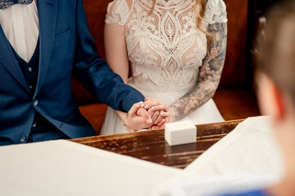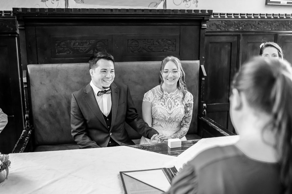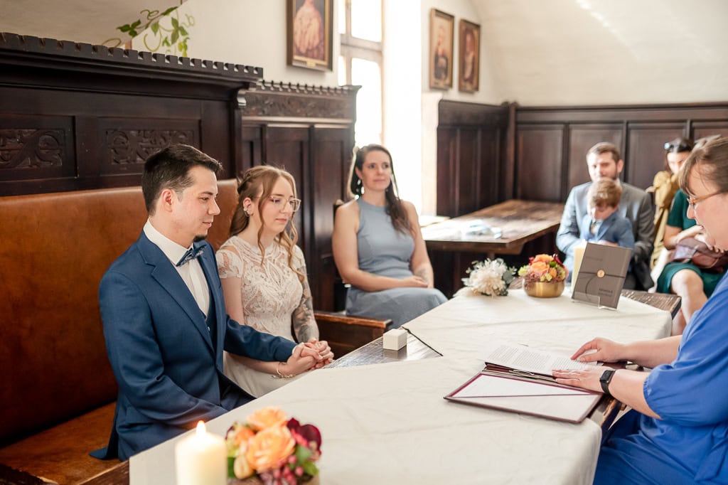 Der Kontrast hätte kaum größer sein können: Draußen brannte die Sonne an diesem heißen Maitag vom Himmel, aber der Trausaal selbst empfing uns mit angenehmer Kühle und dunklem, gemütlichem Holz. Es war eine intime Runde mit etwa 30 Gästen – genau richtig für diesen geschichtsträchtigen Raum, ähnlich intim wie bei dieser Hochzeit: Klein aber Perfekt.