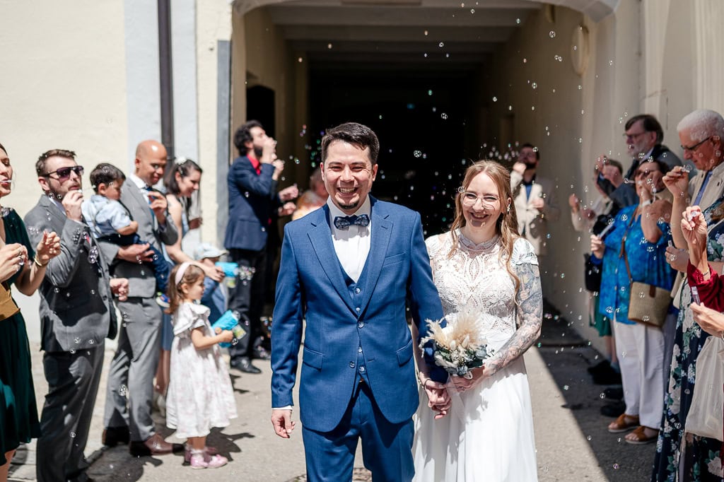 Nach der Zeremonie wartete draußen nicht der graue Asphalt, sondern ein spalierstehender Empfang mit unzähligen schillernden Seifenblasen, durch die das frisch getraute Paar glücklich hindurchlief.