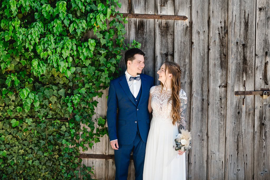 Die Hitze war an diesem Tag wirklich eine Herausforderung. Aber Schloss Kaltenberg bietet zum Glück fantastische Rückzugsorte. Für das Paarshooting haben wir uns ganz bewusst in den Schatten geflüchtet. Wir nutzten die ruhigen Waldstücke und die rustikalen Holzwände, die mit tiefgrünem Efeu bewachsen waren, als natürliche Kulisse. So konnten Katharina und Stefan kurz durchatmen und die Zweisamkeit genießen, während wir wunderschöne, entspannte Bilder machten.