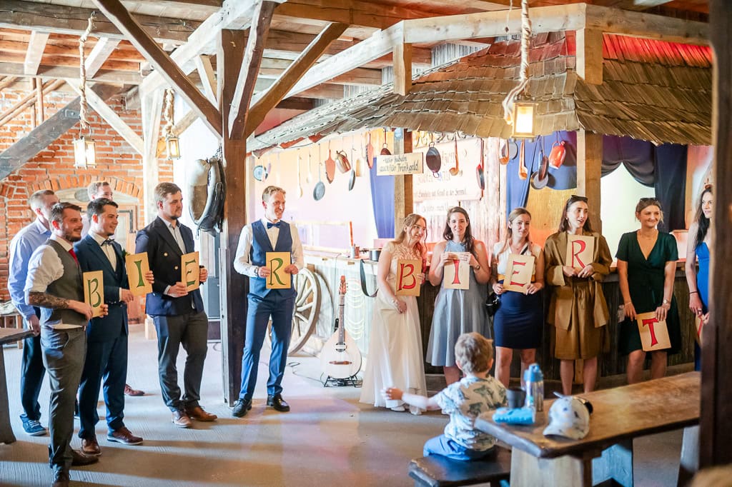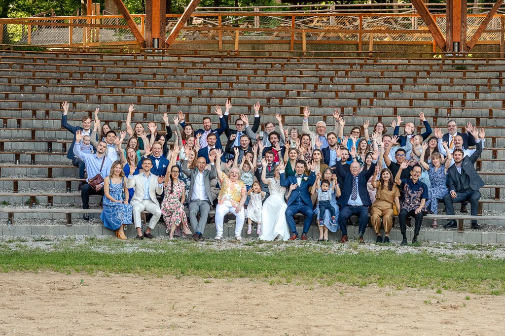 Die Stimmung war unglaublich ausgelassen. Ein Highlight war definitiv das Buchstabenspiel der Freunde: Während die Männergruppe stolz Holztafeln hochhielt, die das Wort „BIER“ bildeten, konterten die Frauen mit einem eleganten „TRAUBE“. Es wurde viel gelacht, geklatscht und einfach gefeiert – fernab von steifen Konventionen. Den süßen Abschluss bildete der Anschnitt der Hochzeitstorte am Buffet, bevor wir uns alle noch einmal für ein großes Gruppenfoto auf der Tribüne der Arena versammelten.